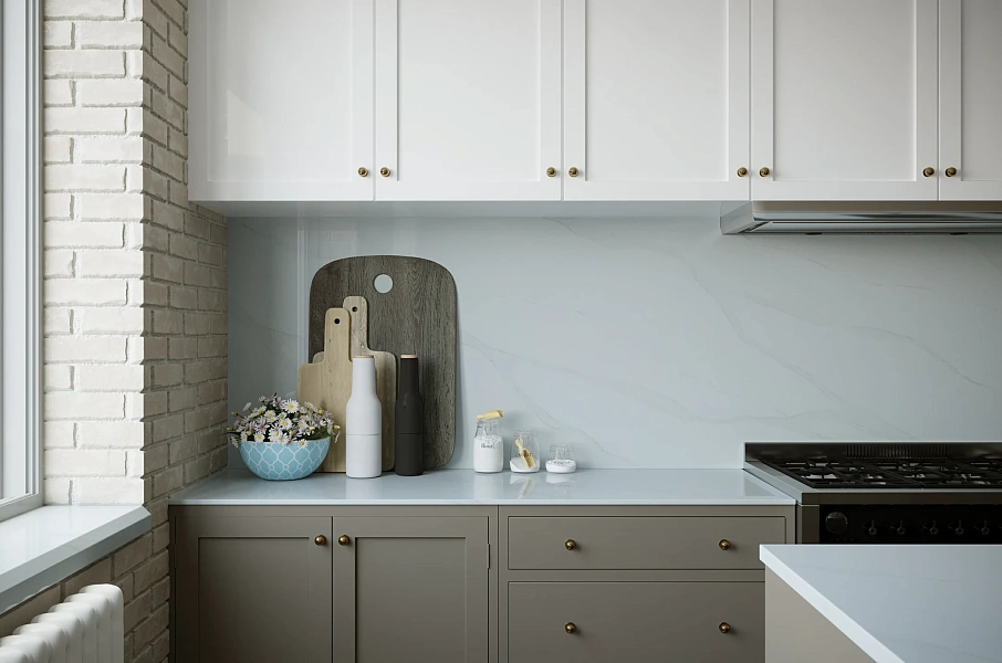 Vicostone Bettoglio BQ-8800 - элегантный кварцевый агломерат с полированной поверхностью, обладающий продольной серо-зеленой жилой. Вдохновленный итальянским мрамором Calacatta. Vicostone Bettoglio представляет изысканный и роскошный внешний вид. Нейтральные светло-серые прожилки и теплый белый фон идеально дополняют друг друга.