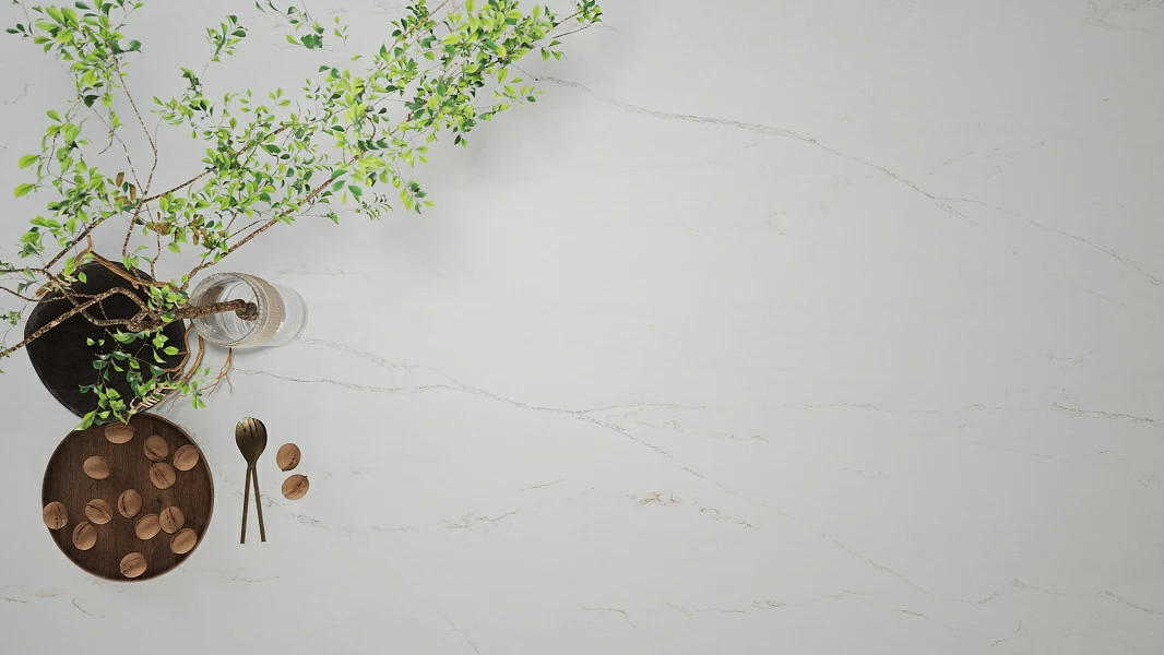 Vicostone Costa Nova - это кварцевый агломерат, вдохновленный красотой бразильского кварцита Taj Mahal. Он имеет мягкий белый фон с нежными теплыми прожилками, что создает ощущение расслабления и напоминает о песчаном пляже.