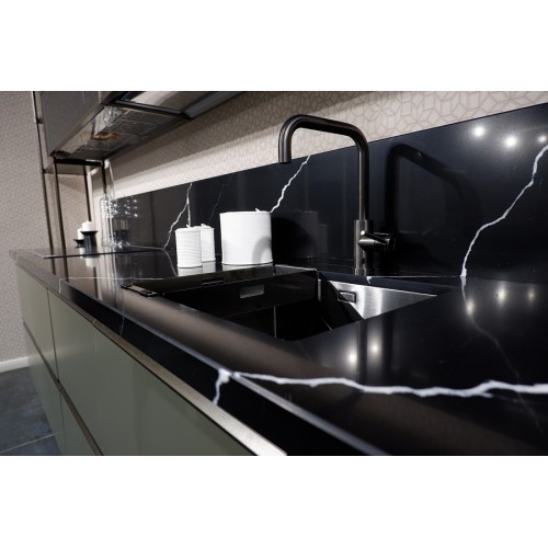 Состав Vicostone Nero Marquina BQ-8740 на 93% включает натуральный кварц, дополненный связующей полимерной смолой и эксклюзивными пигментами для достижения насыщенности и глубины чёрного цвета. Благодаря автоматизированному процессу производства, Vicostone обеспечивает высочайшую устойчивость к физическим и химическим воздействиям, предлагая продукцию, безопасную для контакта с пищей и отвечающую самым высоким требованиям долговечности.